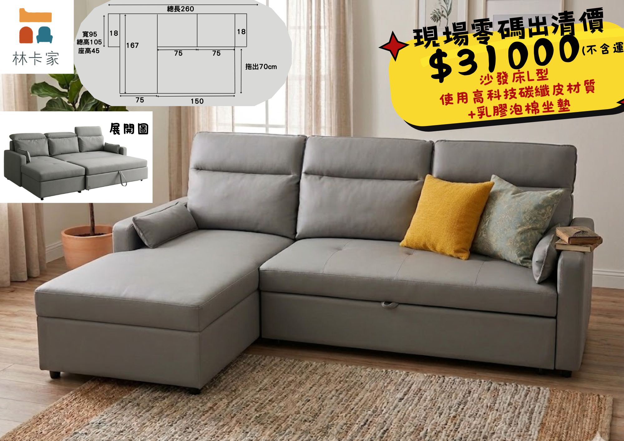L型沙發床•高科技碳纖皮材質